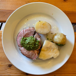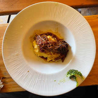 Food suddenly hits the table, a starter of beef brisket on a Polenta mash, OMG! so tender and full of flavour, wish we had a double portion. It was a bloody good start, then followed soon after by fresh sour dough bread and homemade fresh wild garlic and I think a curd cream to dip into, I mean it needed nothing extra, it tasted fantastic.