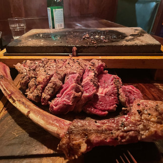 Drinks service is quick and if you pay attention you will also be able to hear the repeated instructions being given to other tables close by. In the end I decided to simply ask the waiter: "What would you have?" he says that to be fair if you want something a bit special he loves the 33 Oz Tomahawk steak with fries and beets! 33Oz!!!!... 33 Oz! My brain struggles to imagine this beast. He then goes on to tell us that the chef will part cook the steak on the BBQ in the kitchen before it is brought to our table, along with a slab of molton hot granite and a sharp knife, because here you cook the meat on a hot stone yourself to your own liking. We’re sold, this steak is enough for two 😁 it’s half a cow, we can't wait...